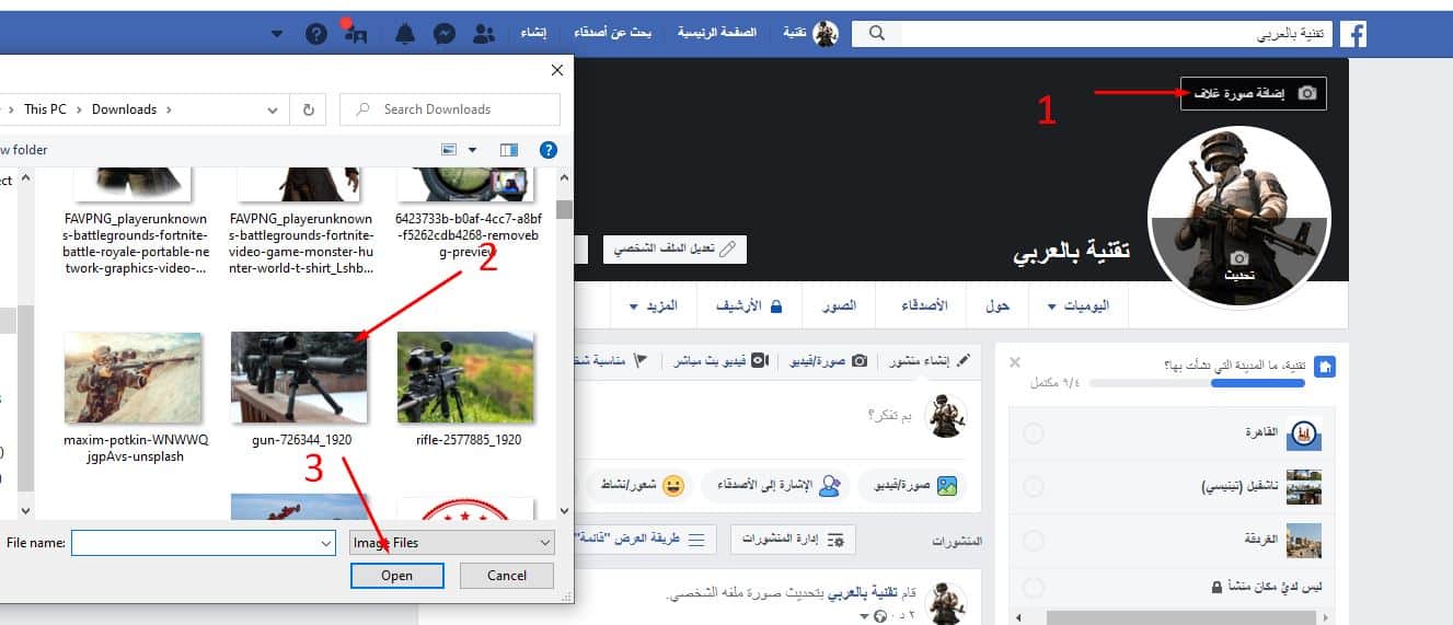 • لإضافة صورة غلاف لصفحتك الشخصية قم بالضغط على إضافة صورة غلاف ثم قم باختيار صورة من جهازك وقم بالضغط على Open .