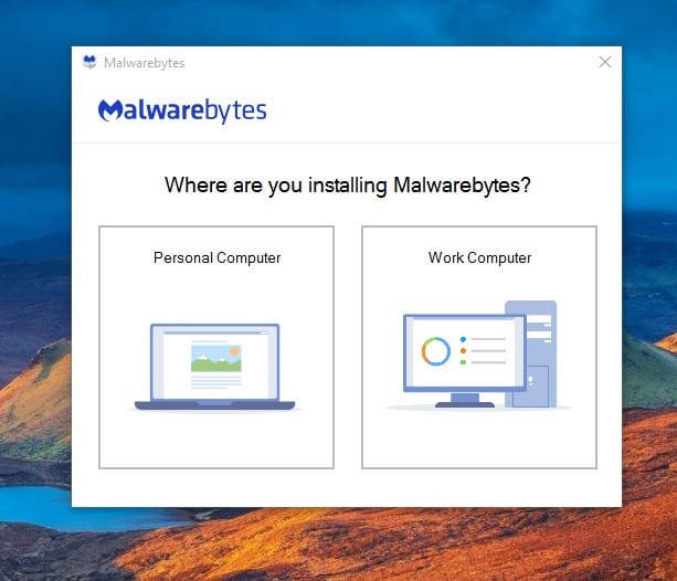 يمكنك عزيزي القارئ تثبيت هذا البرنامج على جهاز الكمبيوتر الخاص بك بكل سهولة فقط كل ما عليك القيام به هو فتح ملف التثبيت الذي قمنا بتحميله سابقاً بعد ذلك ستظهر لك واجهة التثبيت كما هو بتلك الصورة بالضبط وهنا يتم سؤالك إذا كنت تقوم باستخدام وتثبيت برنامج Malwarebytes على جهاز الكمبيوتر الشخصي الخاص بك أم على جهاز الكمبيوتر الذي تقوم باستخدامه في العمل .