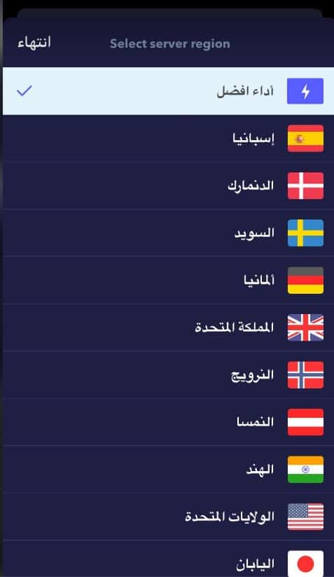 كما يمكنك عزيزي القارئ التعديل على الدولة التي تحصل على اتصالك منها واختيار أي دولة أخرى كما هو بتلك الصورة ولكن نصيحتي التي أقدمها لك أن لا تقوم بتلك الخطوة لإن التطبيق يقوم تلقائياً بالاتصال بأسرع شبكة VPN موجودة .
