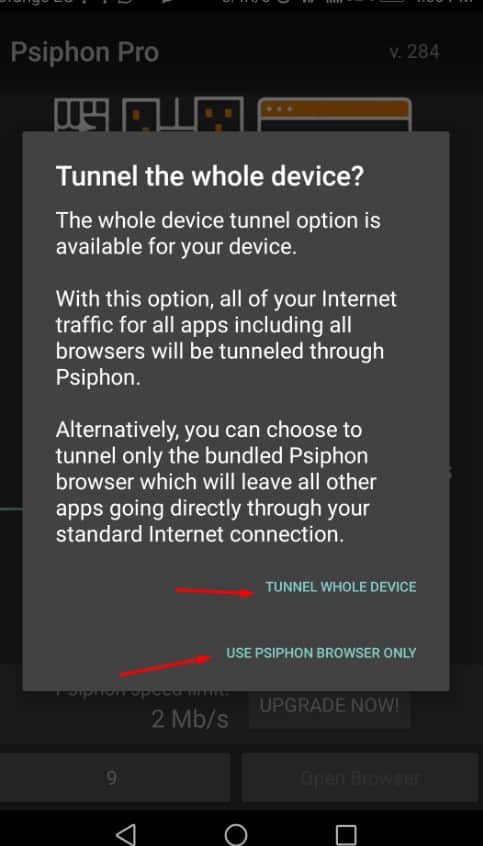 الخيار الأول والمكتوب أمامه Tunnel whole Device يعني أنه خدمة VPN التي ستحصل عليها من هذا التطبيق ستطول الهاتف بأكمله بجميع أجزائه وهذا يعني أنه في حالة استخدام فيس بوك أو انستقرام أو واتساب أو أي تطبيق أخر موجود على هاتفك ستقوم باستخدامه من خلال عنوان IP جديد أما الخيار الثاني والمكتوب أمامه Use Psiphon Browser Only فهذا يعني أنك ستقوم باستخدام هذا البرنامج أو ستقوم باستخدام خدمة VPN على هاتفك من أجل التصفح فقط وهذا يعني أن الخدمة ستعمل فقط على برامج و تطبيقات التصفح الموجودة على هاتفك الاندرويد .