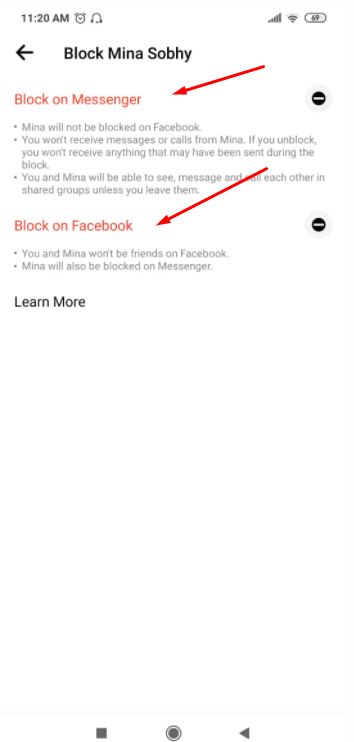 في النافذة التالية سوف تجد خيارين لعمل حظر لهذا المستخدم، الخيار الأول هو Block on Messenger أو حظر على الماسنجر حيث يمكنك حظر هذا الشخص على الماسنجر فقط حتي لا يتمكن من إرسال أي رسائل لك ولكنه يستطيع مشاهدة صفحتك ومنشوراتك على الفيس بوك، والخيار الثاني هو Block on Facebook أو حظر على الفيس بوك وهو خيار حظر شامل عند تفعيله سوف يتم حظر هذا المستخدم نهائياً سواء على الماسنجر أو الفيس بوك ولتنفيذ أي خيار قم بالضغط عليه .