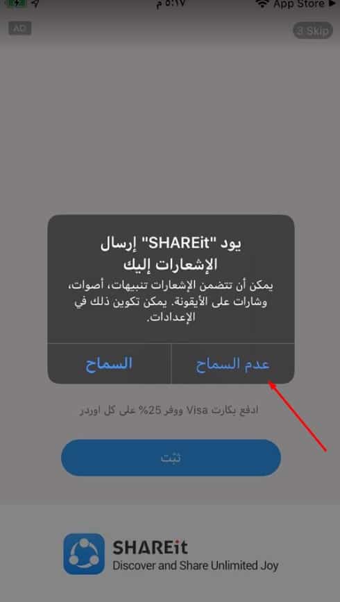 في التدوينة السابقة قدمت لكم أصدقائي شرح لطريقة إيقاف الإشعارات الخاصة بتطبيق SHAREit والتي تسبب إزعاج للكثير من المستخدمين ، وهنا أنت لست في حاجة إلي القيام بالخطوات الكثيرة فقط تأكد عند تشغيل التطبيق لأول مرة على هاتفك الايفون أن تقوم بالضغط على خيار عدم السماح وبتلك الطريقة لن يتمكن التطبيق من إرسال الإشعارات الخاصة به إليك بعد ذلك قم بالضغط على السماح أثناء استخدام التطبيق وهذا فيما يخص إمكانية التطبيق في الوصول إلي موقعك الجغرافي كما هو بتلك الصورة .
