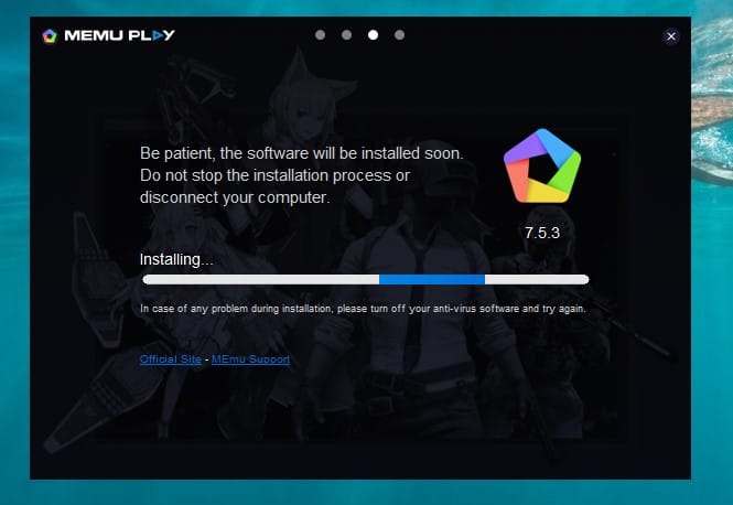 • بعد ذلك سيتم البدء في عملية أخرى وهي التثبيت، وهنا لن تقوم بأي خطوات أيضًا وستنتظر لحين الانتهاء من تلك العملية حتى تتمكن من البدء في تشغيل المحاكي على ويندوز 7.