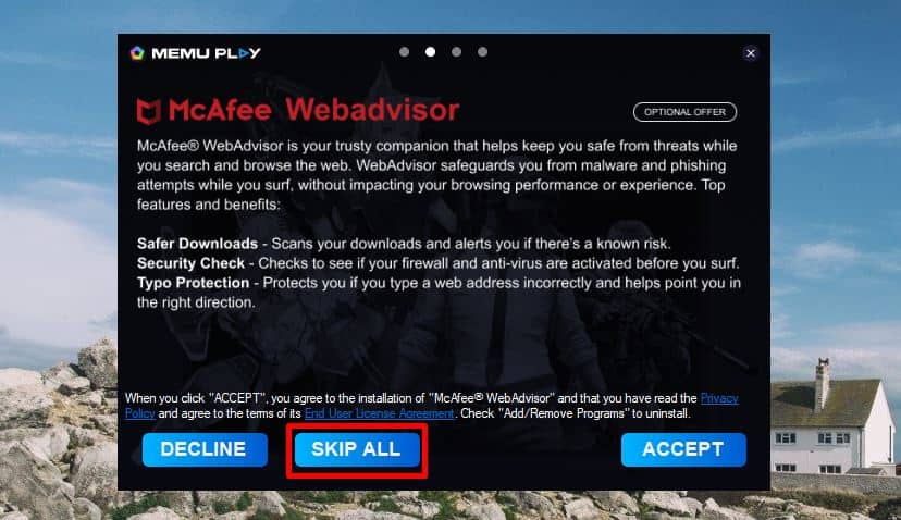 - في النافذة التالية يعرض عليك البرنامج تحميل بعض برامج الحماية، حيث يمكنك القبول عن طريق الضغط على ACCEPT أو الرفض، والاستمرار في تثبيت المحاكي عن طريق الضغط على SKIP All.