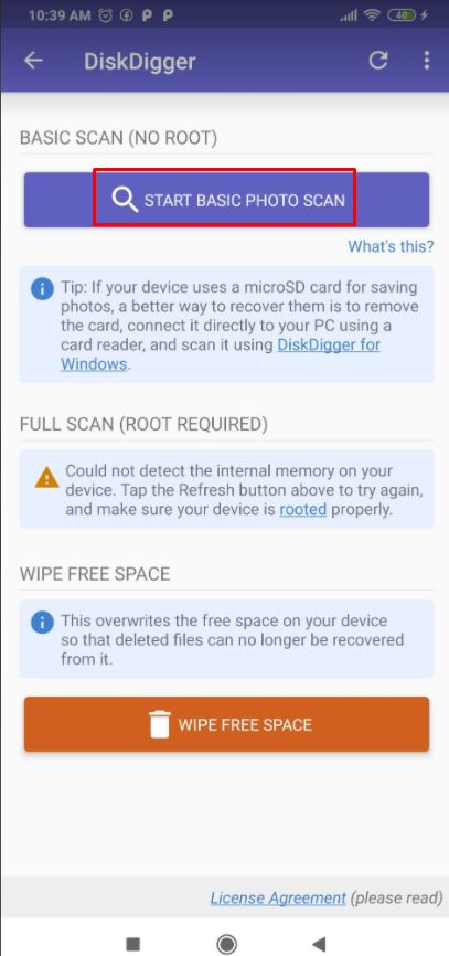 - START BASIC PHOTO SCAN : الطريقة الأولي لاستعادة الصور المحذوفة من هاتفك والتي لا تتطلب وجود صلاحيات الروت أي تعمل بدون روت بهاتفك ويمكنك من خلالها استعادة عدد كبير من الصور المحذوفة .