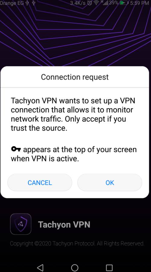 - بعد ذلك قم بالضغط على خيار Ok من أجل منح التطبيق الصلاحيات التي يحتاج إليها حتى يتمكن من البدء في إنشاء اتصال VPN سليم .