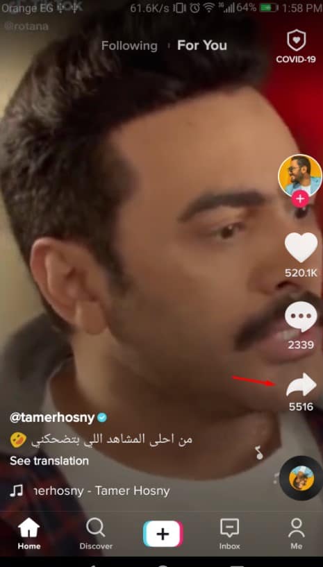 في الحقيقة عزيزي القارئ أنت لست في حاجة إلي الحصول على برنامج من أجل تحميل فيديوهات على تيك توك فكل ما تحتاج إليه هو فتح التطبيق على هاتفك بعد ذلك قم بتحديد الفيديو الذي تريد تحميله على هاتفك وقم بالضغط على علامة المشاركة كما هو بتلك الصورة بالضبط .