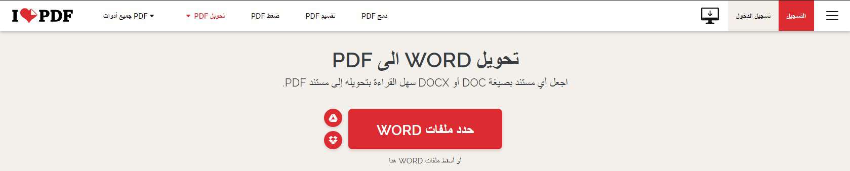- وعلى الفور ستظهر لك واجهة الموقع كما هو بتلك الصورة بالضبط وكل ما عليك القيام به هو سحب ملف Word الخاص بك والذي تريد تحويله وإلقائه داخل نافذة الموقع .