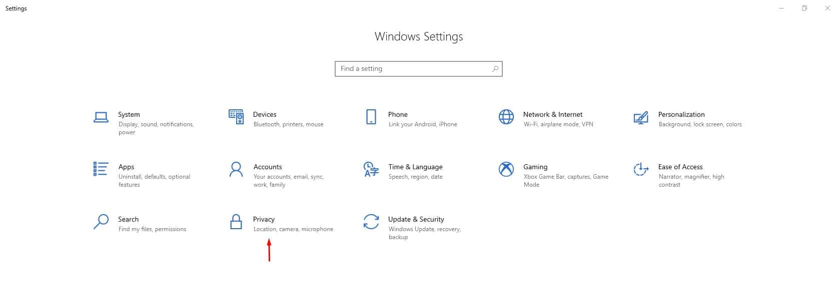 - كل ما عليك القيام به عزيزي القارئ في البداية هو الدخول إلي إعدادات الويندوز من خلال الضغط على علامة الويندوز ثم قم بالضغط على خيار Settings وعلى الفور سيتم تحويلك إلي تلك الواجهة والتي تحتوي على عدد كبير من الخيارات المختلفة والتي تتعلق بكافة أجزاء الويندوز ولكن في تلك اللحظة سنقوم بتجاهل كل هذا وستقوم بالضغط على خيار Privacy كما هو بتلك الصورة بالضبط أو كما يعرف باسم خيار الخصوصية ومن خلاله ستتمكن من البدء في عملية إيقاف البرامج التي تعمل في الخلفية ويندوز 10 .