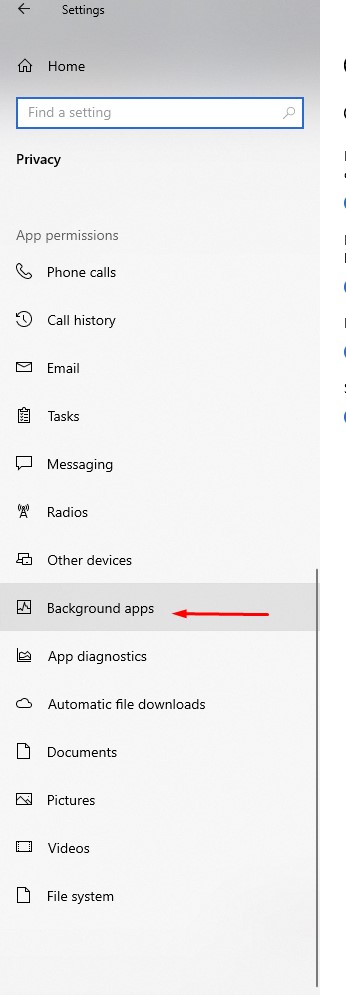 - بعد ذلك ستظهر لك تلك الواجهة والتي من خلالها ستقوم بالضغط على خيار Background Apps ومن خلال هذا الخيار ستتمكن من الوصول إلي التطبيقات التي تعمل في الخلفية الخاصة بنسخة الويندوز ودائماً ما ستلاحظ أن كافة البرامج الموجودة هي برامج الويندوز الأساسية .