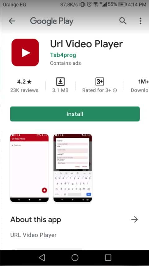 • وعلى الفور سيتم تحويلك إلى داخل متجر جوجل بلاي من أجل تحميل تطبيق URL Video Player.