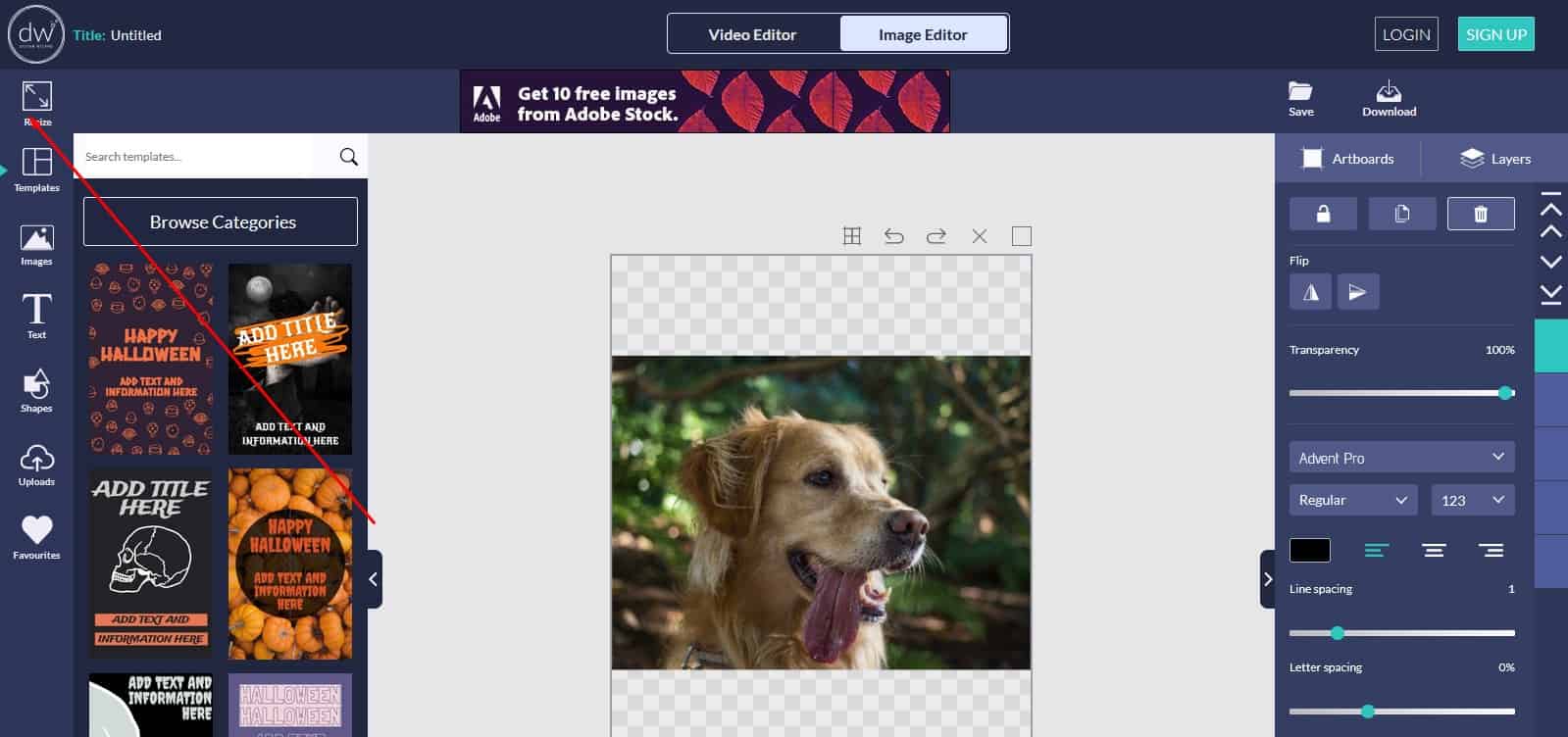 - وبعد ذلك ستجد أن الموقع يقسم القوالب الخاصة به إلي عدة أقسام لك أن تختار القسم الذي يناسب العمل الذي تريده وبعد أن تختار القالب المناسب لك ستظهر لك هذه الواجهة الملئية بالعديد من الأدوات التي تستطيع من خلالها أن تقوم بتصميم تصميم من خيالك كما بالصورة التالية .