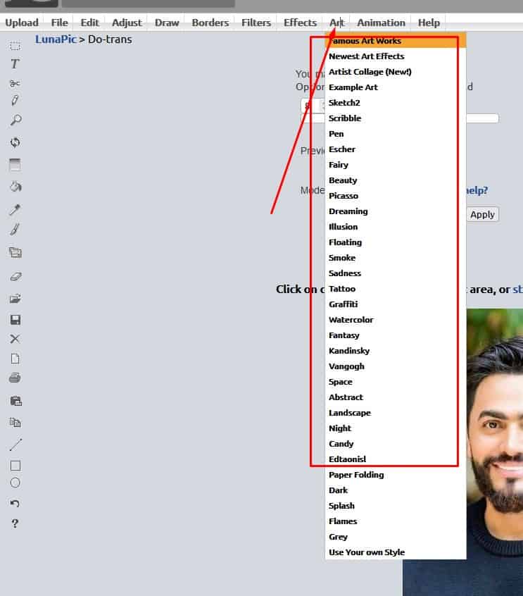 - في البداية حتي تستطيع تحويل الصورة إلي رسمه قم بالضغط على كلمة art الموجودة في الأعلى كما بالصورة التالية وسيظهر لك مجموعة كبيرة من الخيارات قم بالضغط على الخيار الذي تريده .