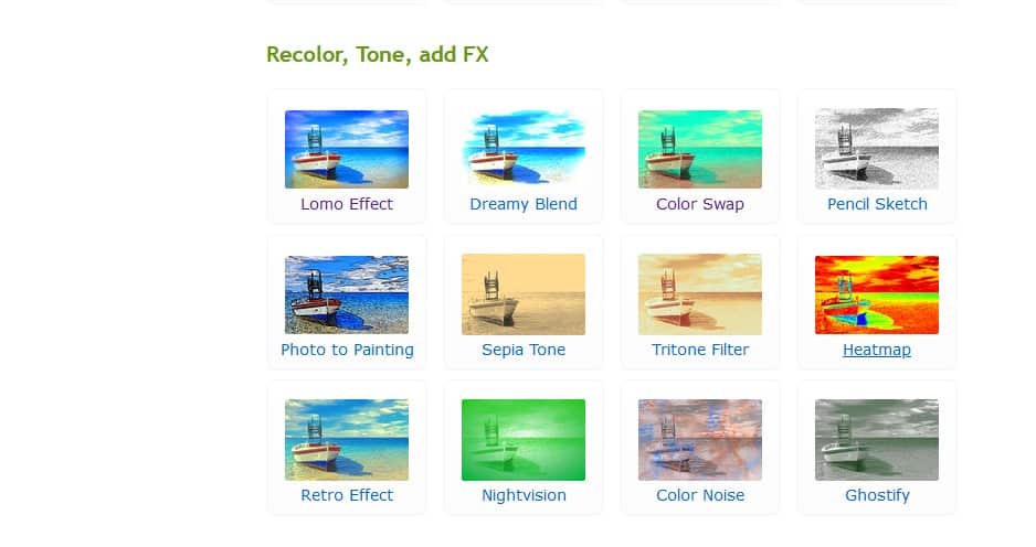 - وكما أخبرتك أن هذا الموقع يوفر لك مجموعة كبيرة من القوالب الجاهزة التي تستطيع أن تستخدمها في تغيير لون وشكل الصورة بشكل كلي وفي الحقيقة هذه الأداة من الأدوات الرائعة التي يوفرها لنا الموقع وهذه الخدمة لا نجدها في الكثير من المواقع الأخري وحتي تستطيع الحصول على هذه الأداة قم بالضغط على خيار Recolor, Tone, add FX كما بالصورة التالية وستجد أنه يندرج تحته مجموعة كبيرة القوالب التي تستطيع أن تستخدمها في هذه المهمة .