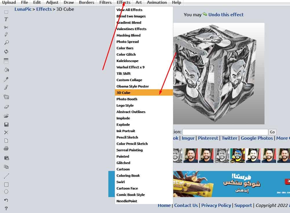 - تستطيع أن تقوم بإضافة الكثير من التأثيرات على الصورة الخاصة بك من خلال الضغط على خيار effects وبعد ذلك سيظهر لك مجموعة كبيرة من الخيارات قم بالضغط على أي خيار تريده على سبيل المثال سأقوم بالضغط على خيار 3D cube كما بالصورة التالية .