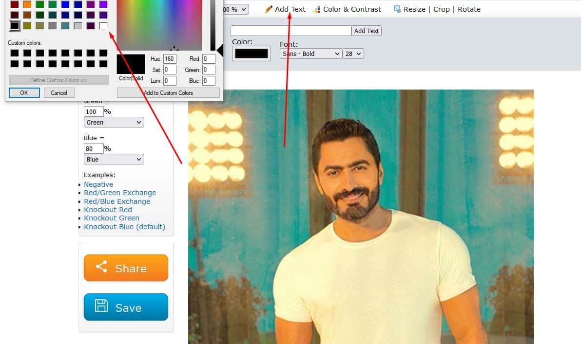 - وحتي تستطيع الكتابة على الصورة الخاصة بك قم بالضغط على كلمة text الموجودة في الأعلى قم بكتابة العبارة التي تريدها في الخانة المخصصة لها ثم بعد ذلك قم بتحديد الحجم الذي تريد أن يكون به حجم الخط ثم بعد ذلك ثم قم بتحديد لون الخط المناسب والمتناسق مع الصورة كما بالصورة التالية .