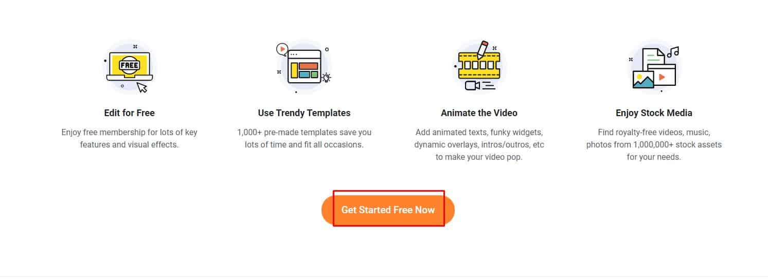 - للبدء في استخدام الموقع لإنشاء فيديو من الصور والموسيقى قم بالضغط على خيار Get Started Free Now.
