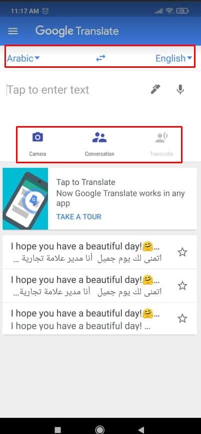 • تستطيع أيضاً بدلاً من استخدام طريقة ترجمة عن طريق كاميرا جوالك القيام بطريقة الترجمة العادية وذلك عن طريق كتابة الكلمة أو النص داخل الخانة المخصصة Tap to enter text لتحصل على ترجمة فورية في الحال .